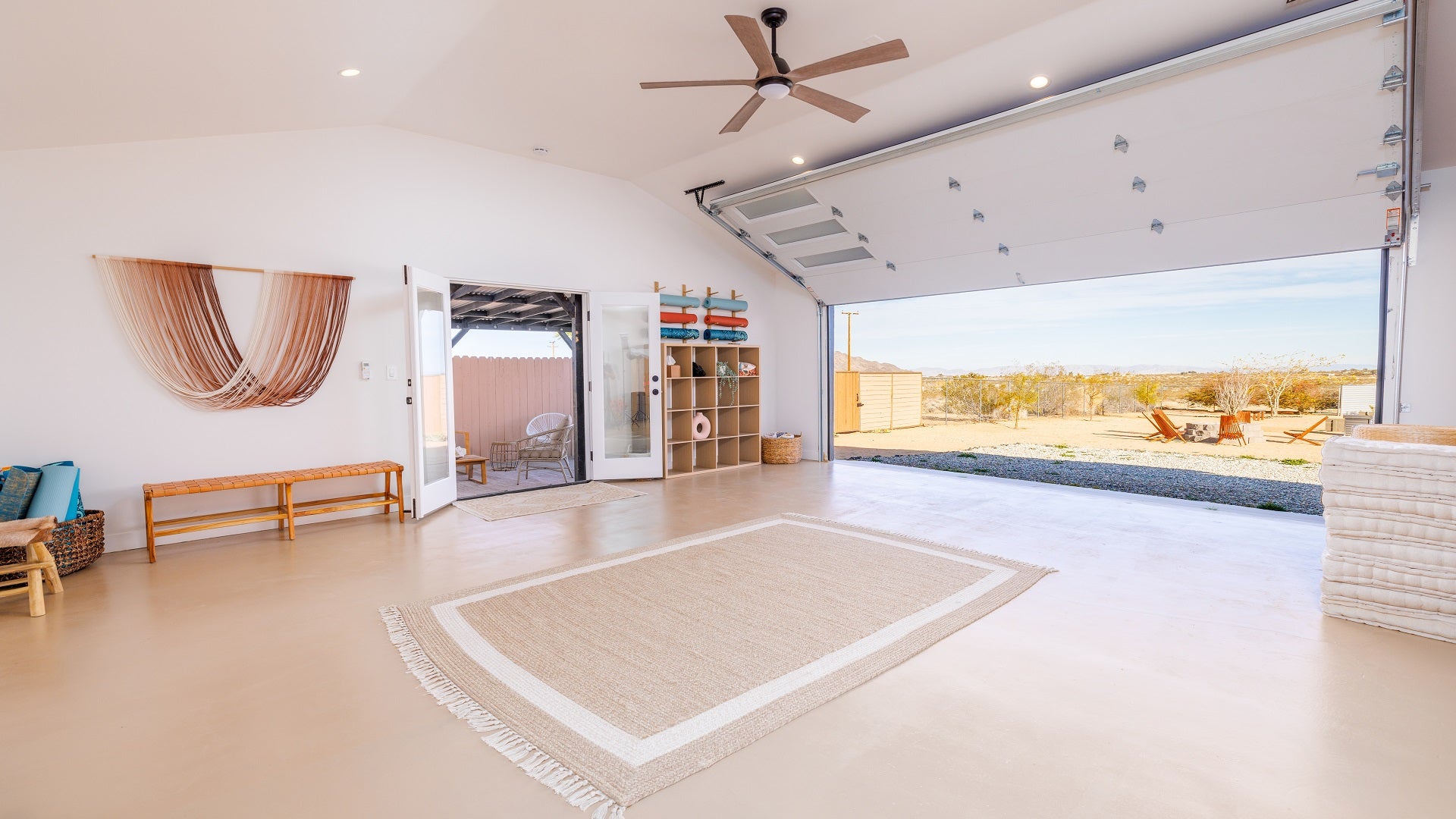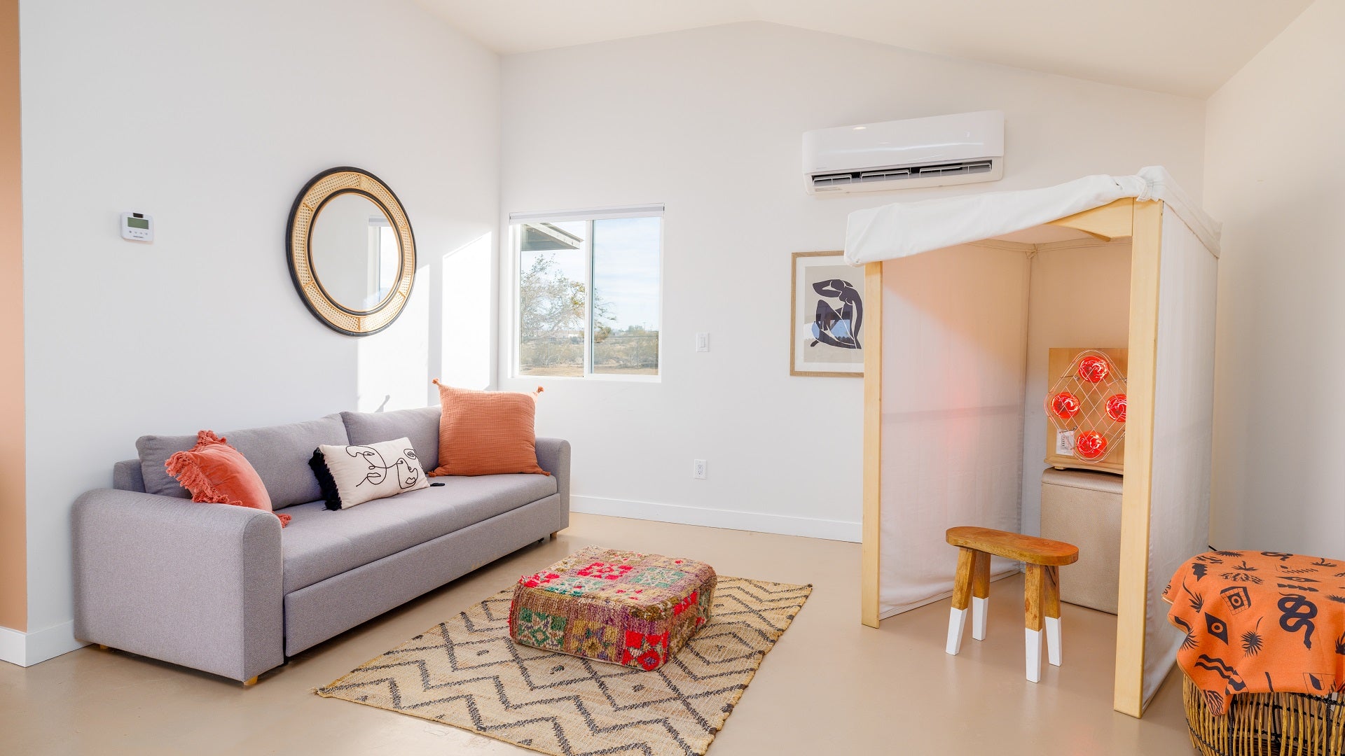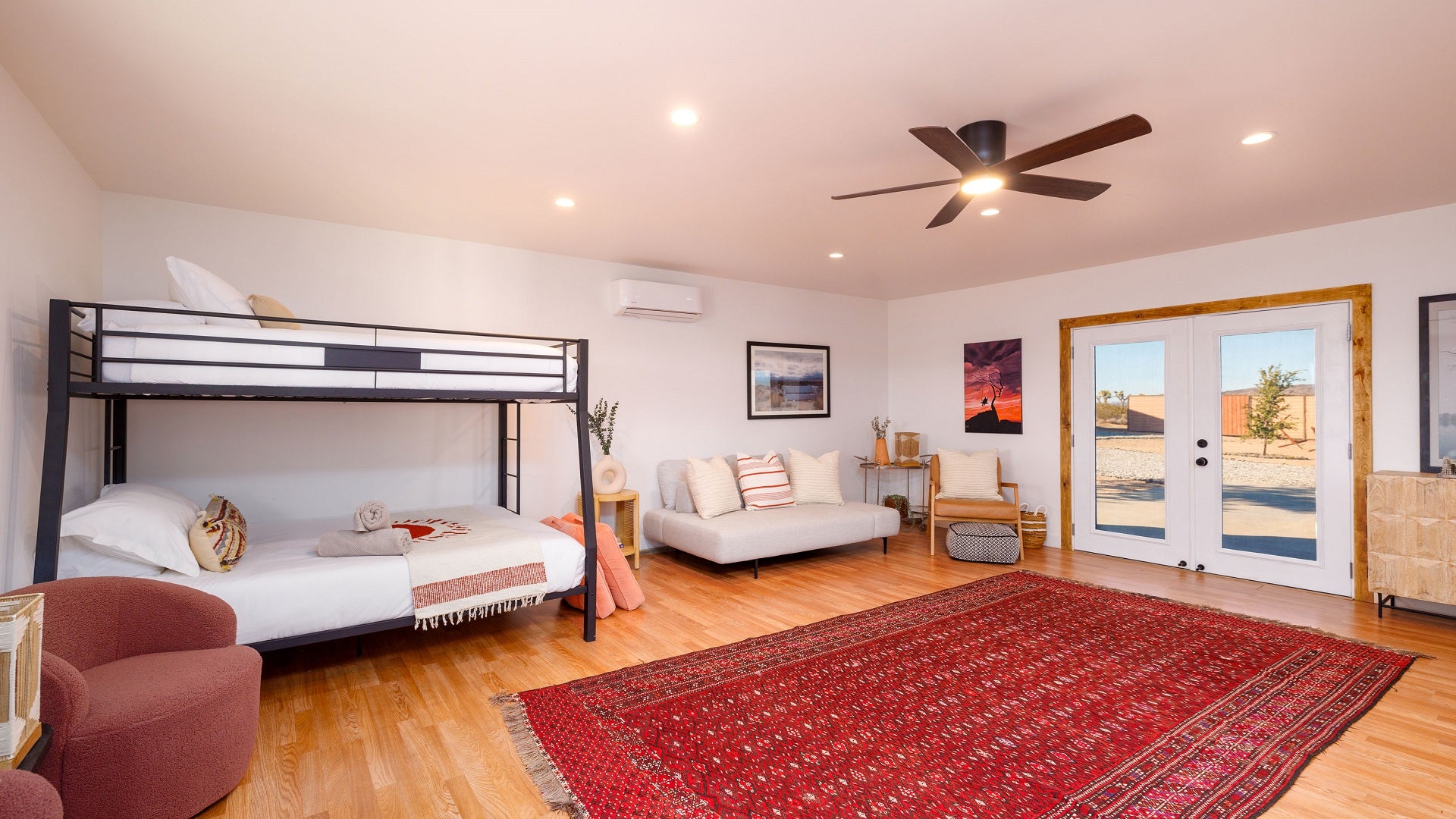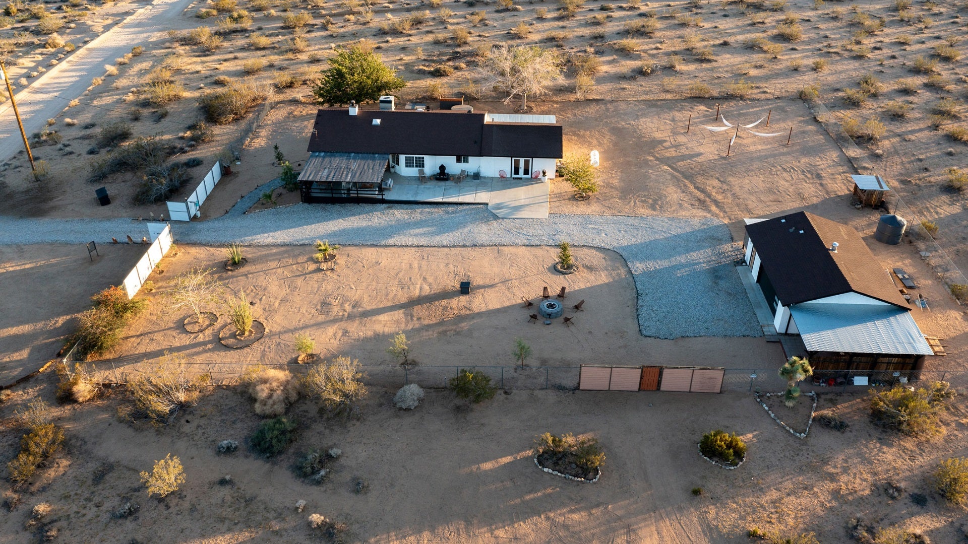 The main house of The Mystic Sky Desert Ranch is a spacious and luminous retreat, adorned with large windows that allow the desert sunlight to flood in, and a prominent firepit that beckons cozy nights under the desert stars. It’s a haven for gatherings, where friends and families can come together to share stories, enjoy delicious meals, and create cherished memories. With a myriad of inviting corners and spaces, it provides the perfect environment to bond, relax, and connect.