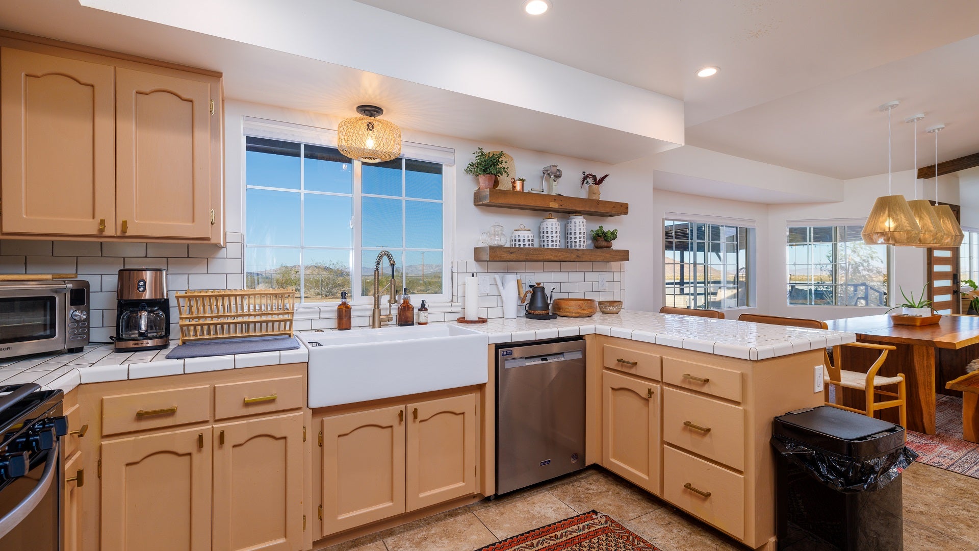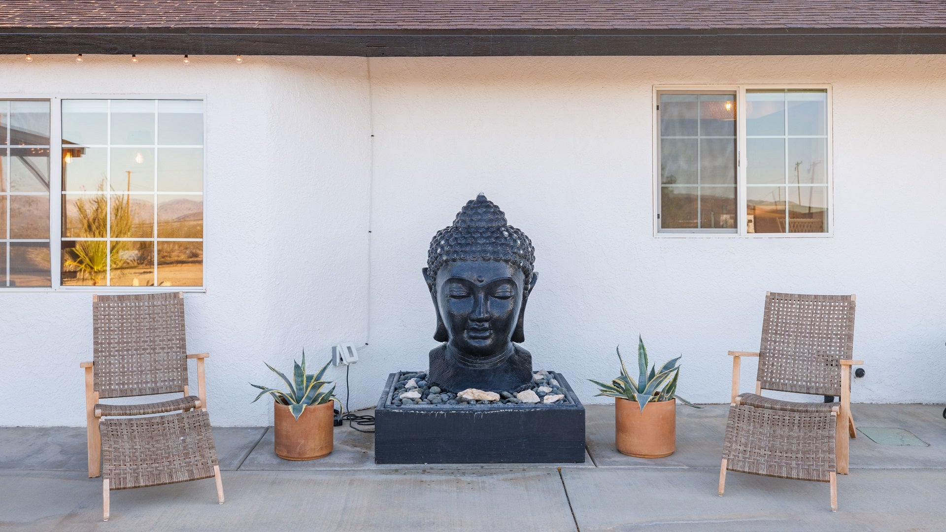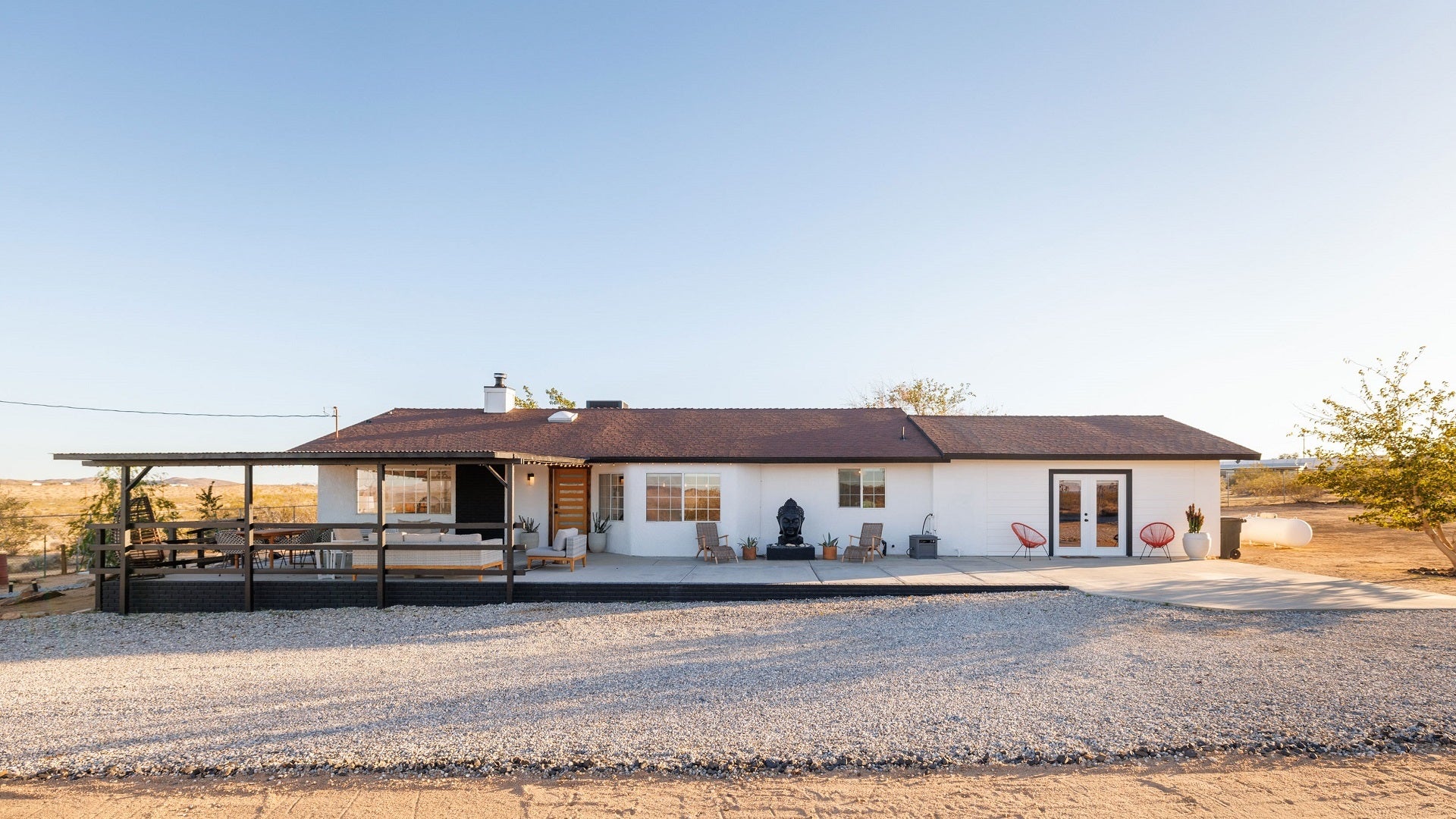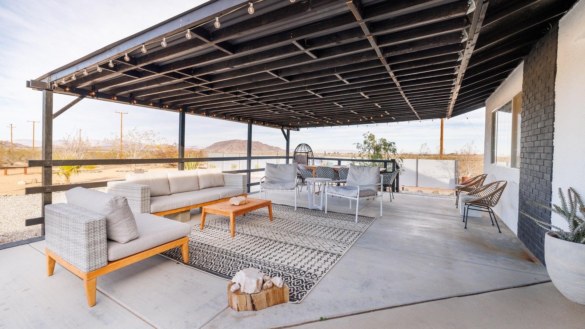 The main house of The Mystic Sky Desert Ranch is a spacious and luminous retreat, adorned with large windows that allow the desert sunlight to flood in, and a prominent firepit that beckons cozy nights under the desert stars. It’s a haven for gatherings, where friends and families can come together to share stories, enjoy delicious meals, and create cherished memories. With a myriad of inviting corners and spaces, it provides the perfect environment to bond, relax, and connect.